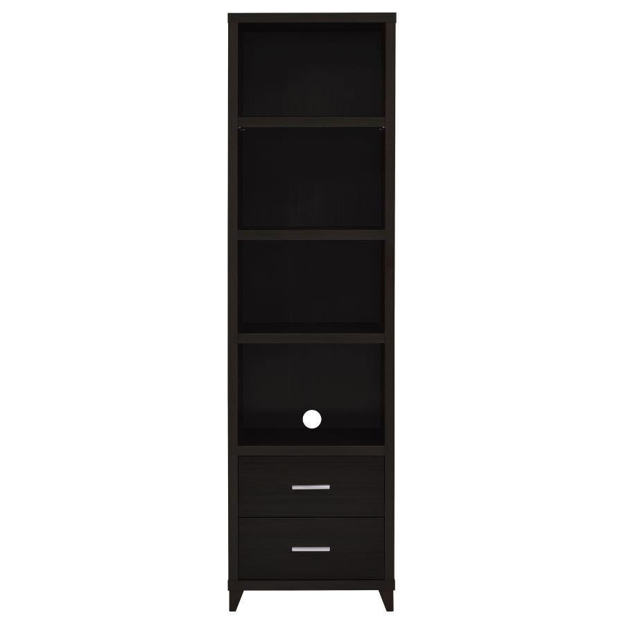 • Twin media towers each feature four open shelves and two drawers for organization