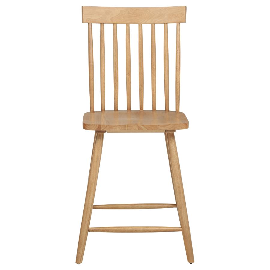 Classic and casual with a fresh farmhouse flair, this Windsor-style counter height chair features a high spindle back and gently contoured seat for timeless comfort. The clean silhouette is crafted from solid rubberwood with a rich wood veneer that enhances its natural grain. Angled legs with double stretchers offer reliable support and charm. Ideal for kitchen islands, pub tables, or counter-height dining spaces.