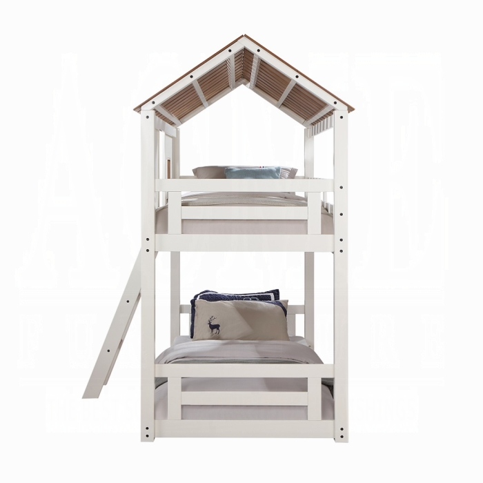 Looking for a unique and charming bunk bed for your child's room? Look no further than our Inara bunk bed. This bunk bed is designed to ignite your child's imagination, with its whimsical house-shaped design and rustic touches that transport them to a world of adventure and wonder. With two windows, your child will love peeking out and enjoying the views, whether they're daydreaming or playing with friends. The ladder provides easy access to the top bunk, and the sturdy construction ensures safety and durability for years to come. The rustic oak slatted roof adds a touch of warmth and charm, while the white finish creates a clean and bright atmosphere that complements any decor style.