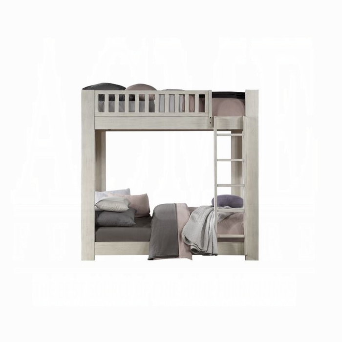 This bunk bed strikes a classic silhouette with vertically slatted guardrails. Each bed features a slat system (14+14) to accommodate your preferred mattresses (not included) without the need for bulky box springs or bunkie boards. The low-profile bottom bunk allows for more space between bunks, no more bumping heads when getting up. The bed is finished in a weathered white for a rustic look.